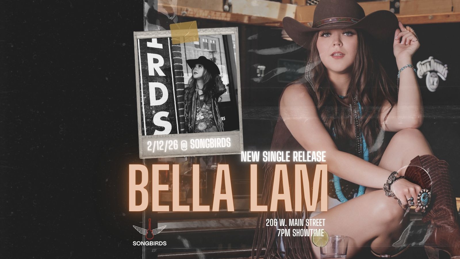 Bella Lam is a rising country artist from Jackson, TN, now based in Chattanooga. Known for blending Southern grit with pop-rock sparkle, Bella’s songs are raw, relatable, and full of heart. On February 12th, 2026, Bella returns to Songbirds to celebrate her upcoming release, “Take It Out On My Guitar,” a powerful new single that turns heartbreak into an anthem of strength.
